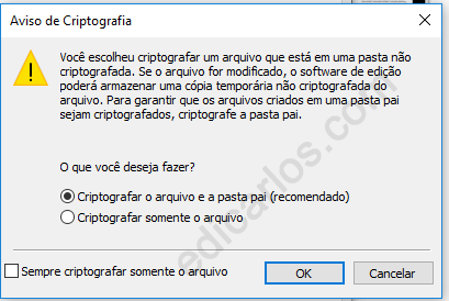 3º O sistema irá perguntar se deseja criptografar o arquivo e a pasta pai, sendo este o método mais recomendado (pelo motivo descrito na imagem), ou somente o arquivo.