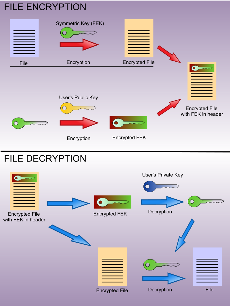 Criptografia: primeiramente o sistema criptografa o arquivo utilizando uma chave simétrica (File Encryption Key –FEK). Em seguida, a chave simétrica é criptografada com um par de chave pública/privada (RSA) para um usuário sendo salva no cabeçalho do arquivo criptografado.